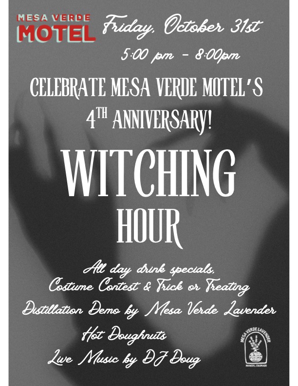 Join us as we celebrate FOUR magical years at the Mesa Verde Motel with our Witching Hour Anniversary Bash! We’re mixing a little Halloween spirit with small-town charm, think festive drink specials, a live lavender oil distillation demo with Mesa Verde Lavender, trick-or-treating fun, and a spirited costume competition. Come raise a glass, cast a spell, and help us toast to four years of community, creativity, and cozy stays under the Mancos moon.